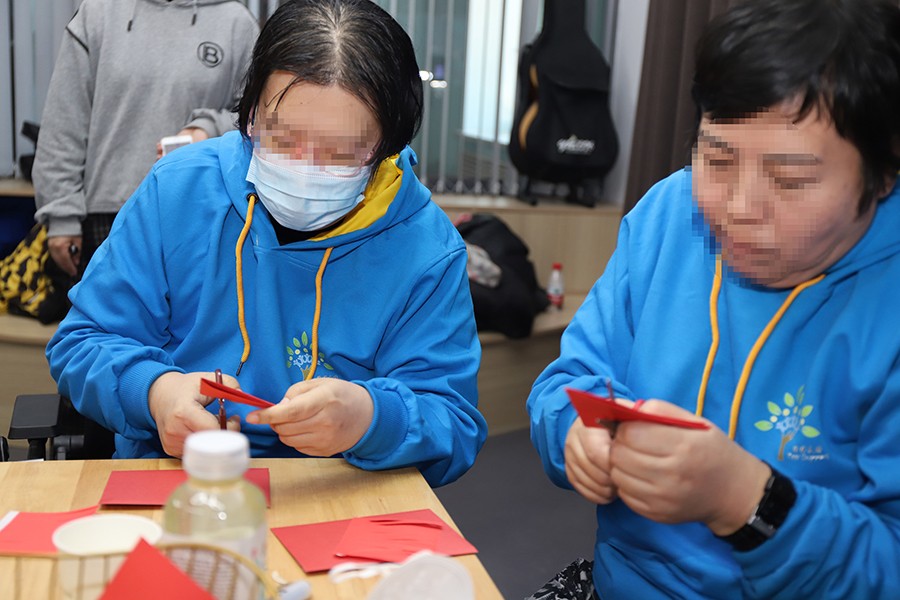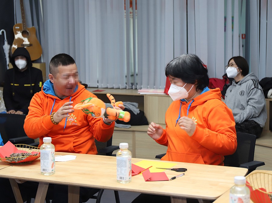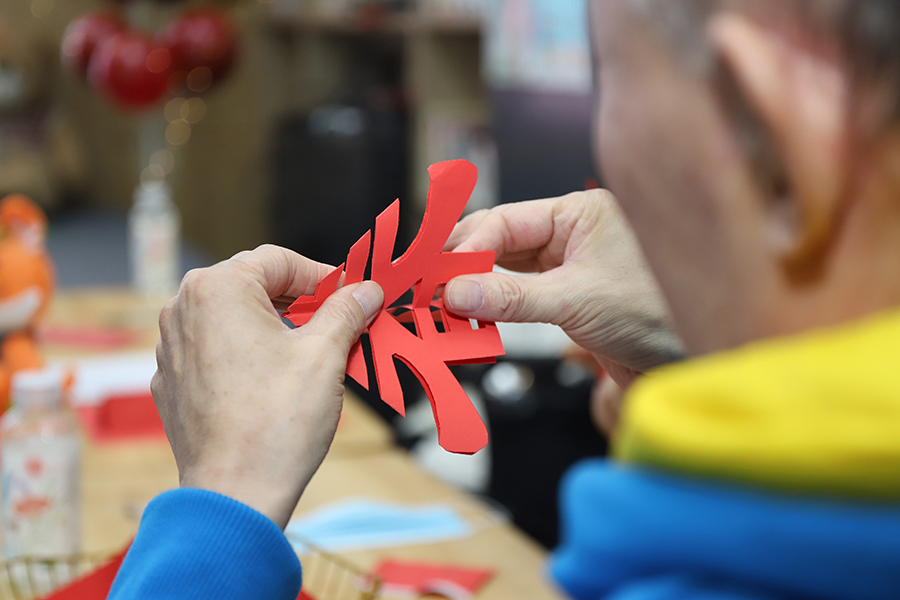 随着联谊会活动的进行,同伴们带着对未来美好的期望和憧憬,字字真切地在“新年愿望清单”写下对彼此的祝福和新年愿景;激烈地“击鼓传花”游戏中大家默契地快速传递手中玩偶,落花者接到递过来的玩偶,也大方地分享自己生活中的趣事感言;在医生和社工的帮助下,同伴们学会了传统技艺“剪春字”,红红火火的年味儿就此从他们的手中飘散开来……