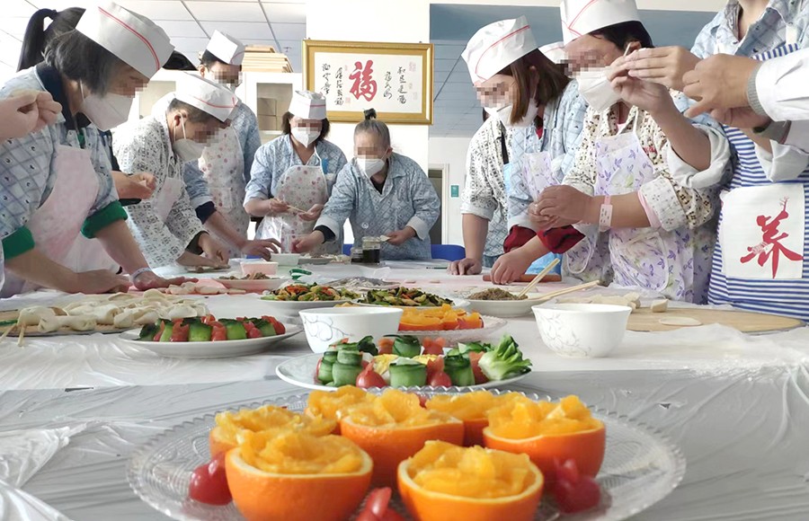在随后的包饺子环节,大家迫不及待系上围裙、头戴厨帽、挽起衣袖,俨然一副专业厨师的打扮。有的人和面、调馅、擀皮、包饺子,有的人制作精巧的水果甜点,众人齐心协力、各展其能,不一会儿,一盘盘热气腾腾的饺子和果盘就端了上来。品尝着自己的劳动成果,大家脸上露出了笑容,成就感满满。