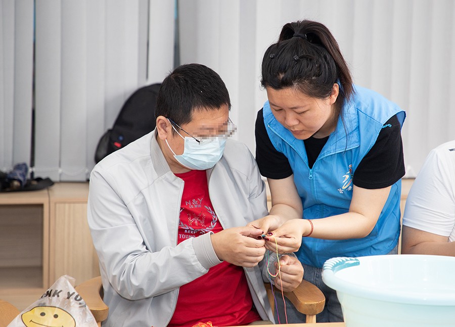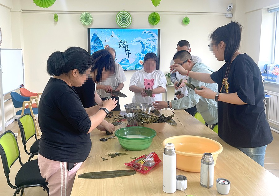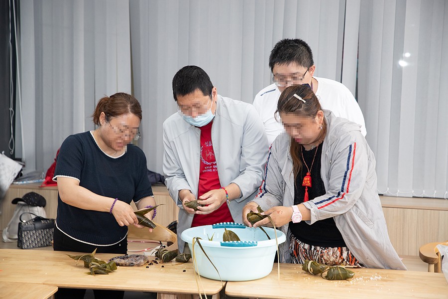 虽然一开始包出的粽子歪歪扭扭的,但同伴们看得仔细、学得认真,在其乐融融的氛围中,通过锻炼同伴的手眼协调能力,还帮助他们进行心理解压,在日常点滴中帮助他们重新树立自信心,恢复社会功能,满足患者自我价值实现的需要。