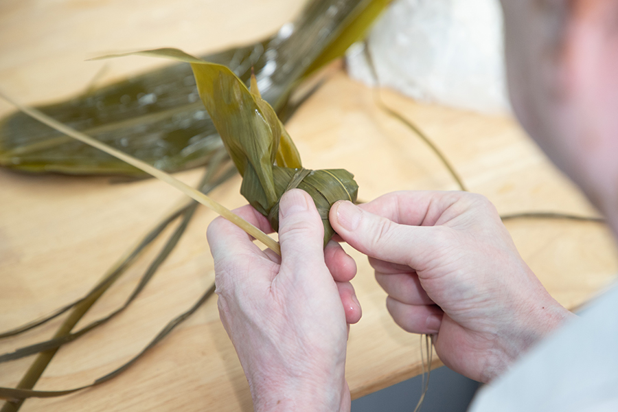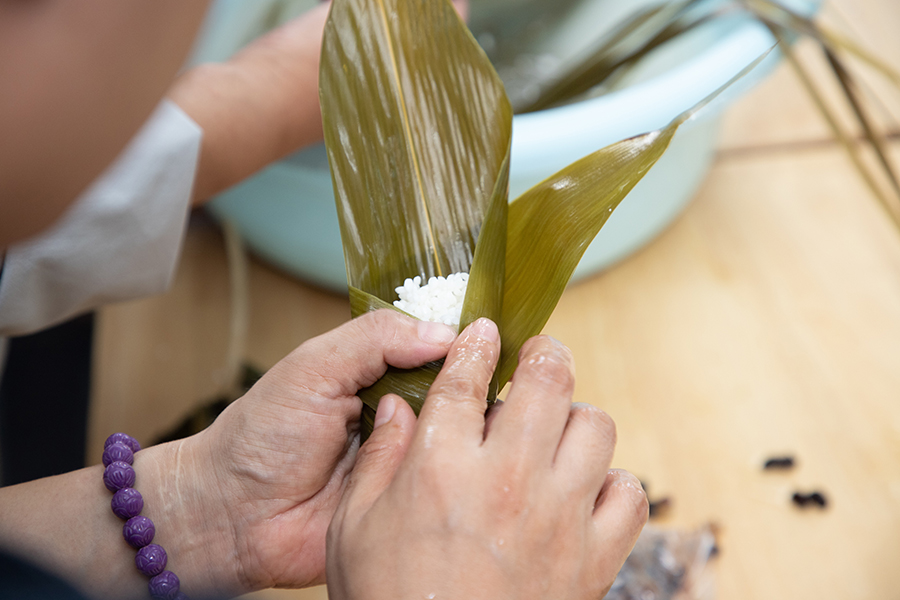 当天一早,活动现场就摆放好了包粽子所需的食材,同伴们分组后纷纷围在桌子两边,跃跃欲试的想要一展身手。“先把粽叶洒上水,然后将它们凹成漏斗状捏紧,盛入糯米、埋入三五个小枣儿,粽叶一合,绳子绑紧,粽子就包好啦。”经验丰富的同伴手把手教学,康复师和社工耐心地向新手传授经验,大家在欢声笑语中话家常、聊变化,一起交流探讨各地端午文化习俗……不一会儿,在一双双巧手下,一个个棱角分明、玲珑可爱的粽子呈现在大家面前。