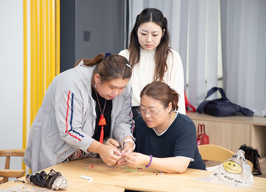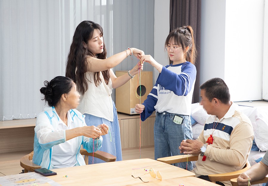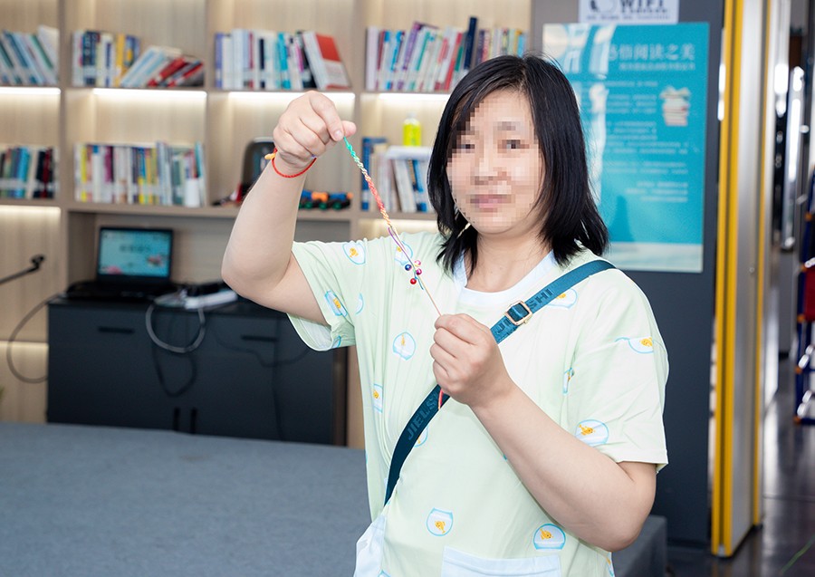 随后,在同伴辅导员的细心讲解下,同伴们两两结对,认真学习编织五彩绳。经过压、挑、穿、拉等步骤,一条条有着漂亮的纽扣结、蛇结的五彩绳就这样诞生了。大家将制作好的手绳迫不及待地为对方戴上,在相互欣赏的同时,一张张脸上洋溢着幸福的笑容。