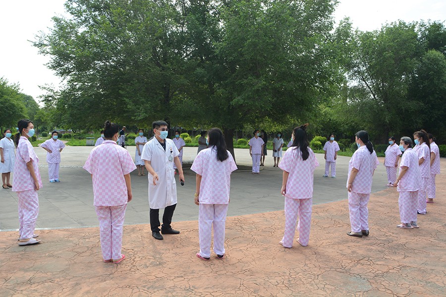 6月29日上午,医技党支部和康复科组织住院休养员共同庆祝党的生日。在线德州扑克网 党委书记、院长桑红参加了唱国歌、带领休养员户外康复等活动。