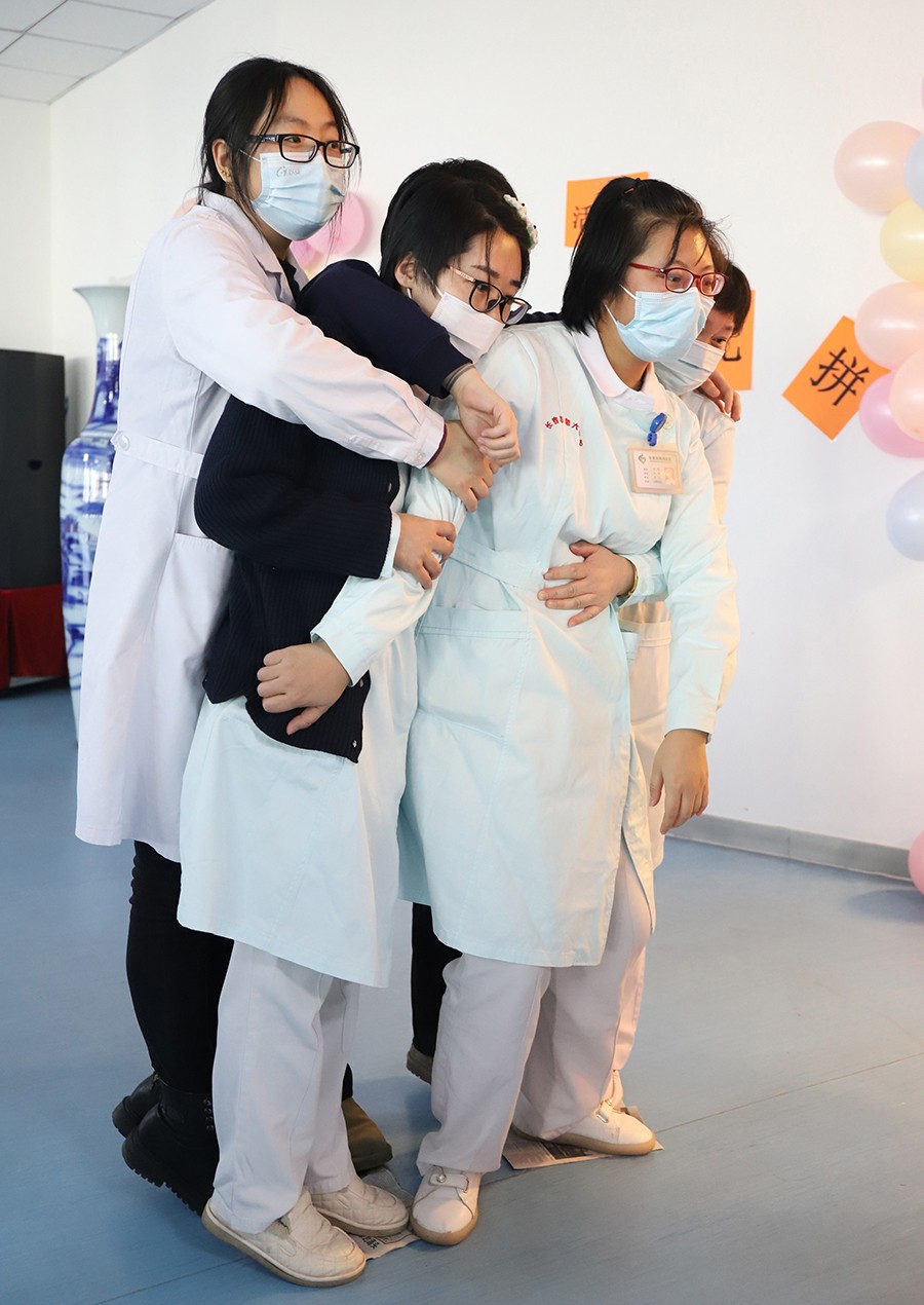 现场最热闹的项目要属“快乐呼啦圈”了,规则是两人一组,谁转的时间长谁获胜。在比赛现场,心理科五疗区护士张妍玥表现抢眼。虽然对手十分强大,但她仍凭借着灵活的腰身和稳定的转速,完胜对手。赛后,面对着众人的喝彩,她也忍不住“自夸”起来:“摇呼啦圈是我特长,可以挑战全院……”众人跟着大笑。同是心理科五疗区的护士刘雪松更是战绩非凡,在跟同事交流的时候说:“也没费什么劲,就拿了四个一等奖和四个二等奖!”