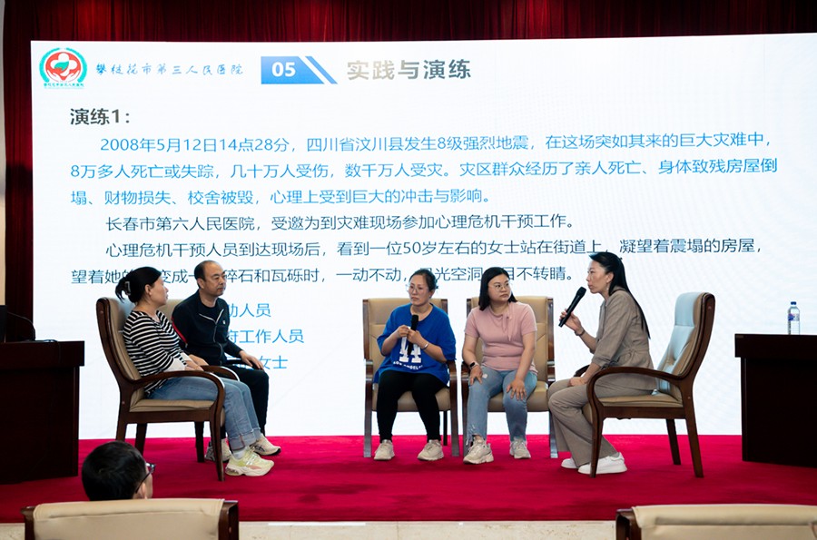 培训后,全体学员结合实际案例进行现场模拟演练,内容从危机干预启动、专业分级、响应干预、信息上报、干预终止等方面内容,对心理危机干预应急预案全过程进行分组演练,全面检验危机干预队伍应对突发事件的心理救援能力,以及各部门间的协作能力。