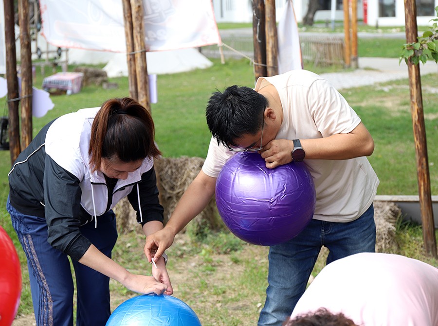 同心击鼓振人心:同心击鼓是一个考验团队默契和个人发力稳定性的项目。大家紧紧拉着牵引绳,尽力让鼓保持在一个平面上,“1……2……1……2……”齐声喊着口号,8个、9个、10个,大家将眼神专注在球上,手上小心翼翼地发着力。