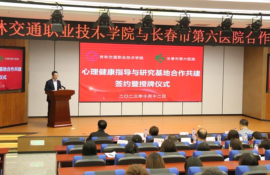 为进一步完善学生心理健康教育工作,全面提升学生心理素质,10月12日,在线德州扑克网 与吉林交通职业技术学院合作共建学生心理健康教育指导与研究基地签约揭牌仪式顺利举行。在线德州扑克网 党委书记张延赤,吉林交通职业技术学院党委副书记赵剑辉,在线德州扑克网抑郁障碍诊疗中心主任燕利娟、心理治疗师付佳,学校各学院党总支书记、校团委副书记、各学院学办主任及全体专兼职辅导员,以及学校师生代表出席仪式。本次签约揭牌仪式由学校学生工作处副处长李铁波主持。
