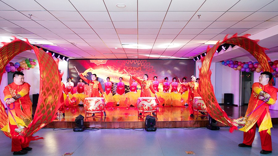 鼓乐滔滔、红浪阵阵。在擂鼓者时缓时急的鼓点声中,舞者手中的龙形彩带宛若一条条身姿矫健、翻腾飞舞的中国龙上下翻飞。蕴含中国传统文化的开场龙鼓舞带来的欢乐与震撼,瞬间点燃全场气氛,新春联欢会就在这热闹的氛围中正式拉开帷幕。