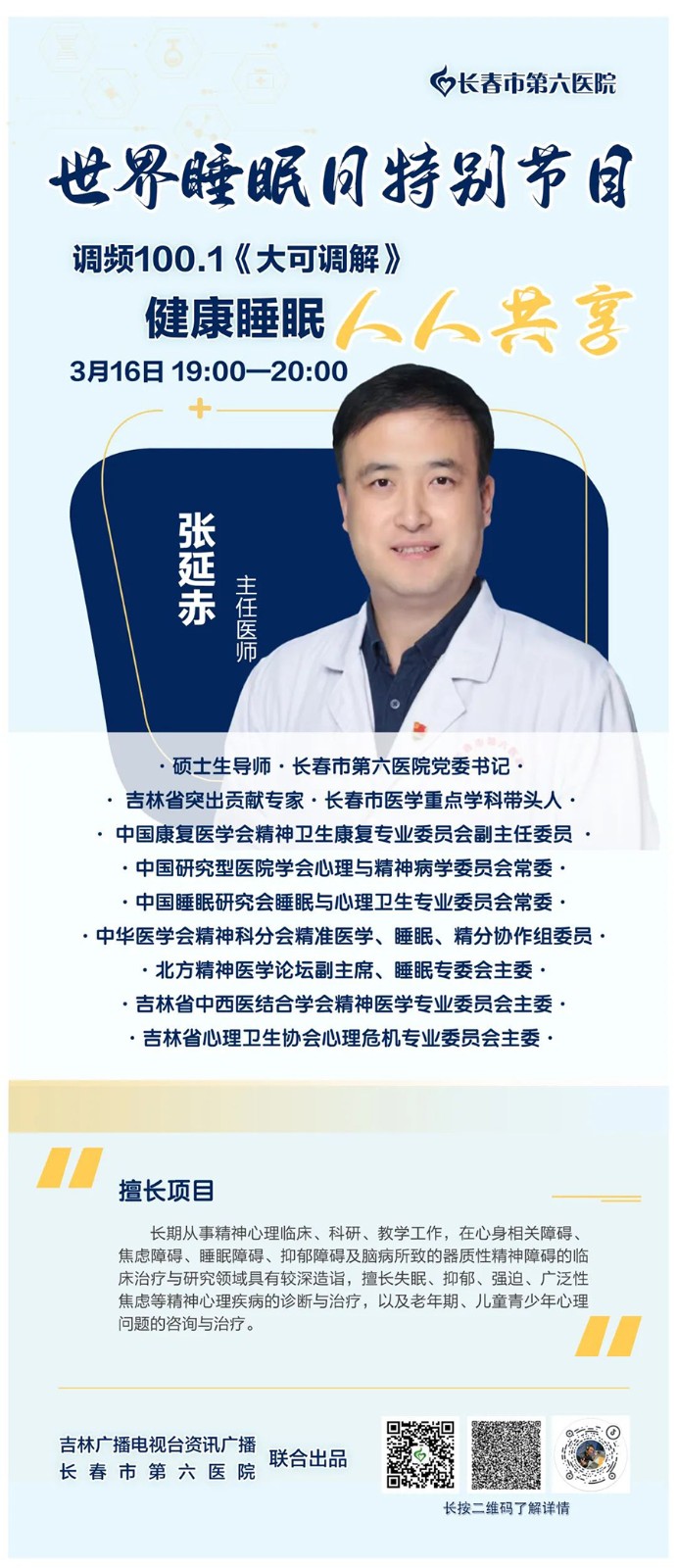 为提高大众对健康睡眠关注度,加大科普宣传力度3月16日,在线德州扑克网 党委书记、睡眠学科带头人张延赤教授做客吉林广播电视台咨讯广播《大可调解》世界睡眠日特别节目,敬请关注!
