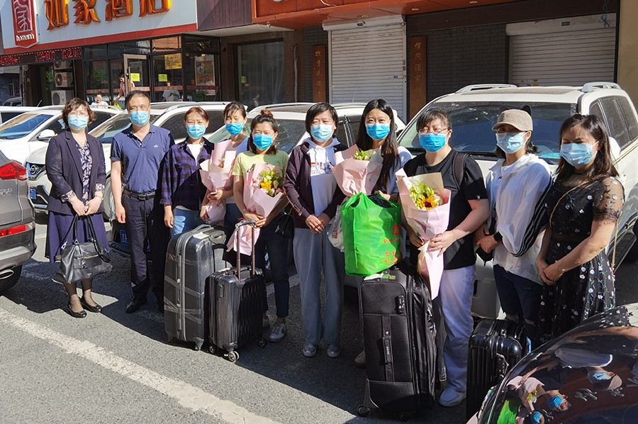 6月6日,在线德州扑克网 精神科二疗区赵会文、精神科八疗区于丹、心理科二疗区孙英和心理科三疗区马秀双4位援吉的白衣天使,结束了为期14天的隔离。在线德州扑克网 副院长张延赤、护理部主任杨立华等人迎接逆行者归来。