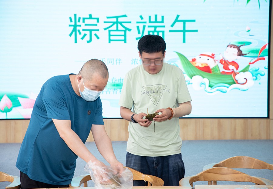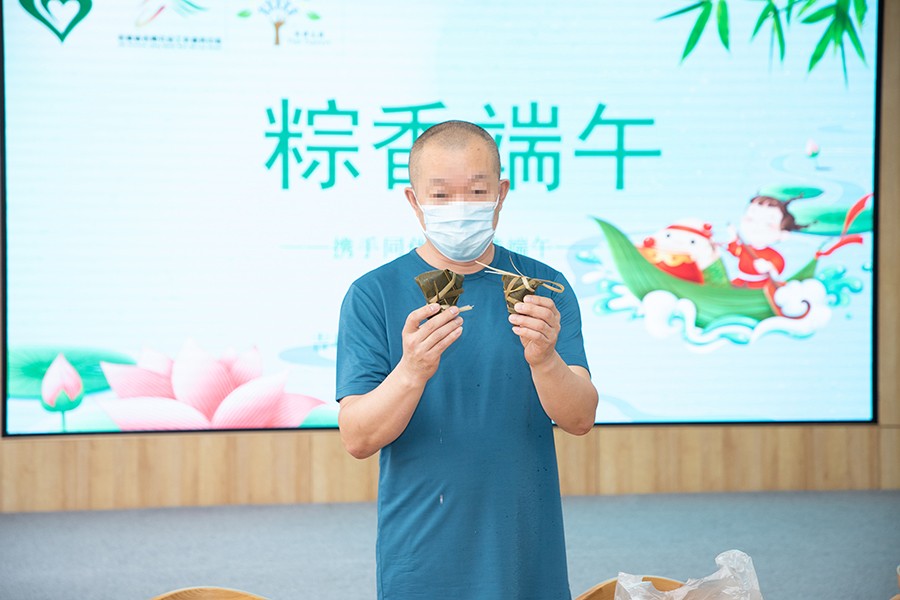 虽然一开始包出的粽子歪歪扭扭的,但同伴们看得仔细、学得认真,在其乐融融的氛围中,通过锻炼同伴的手眼协调能力,还帮助他们进行心理解压,在日常点滴中帮助他们重新树立自信心,恢复社会功能,满足患者自我价值实现的需要。