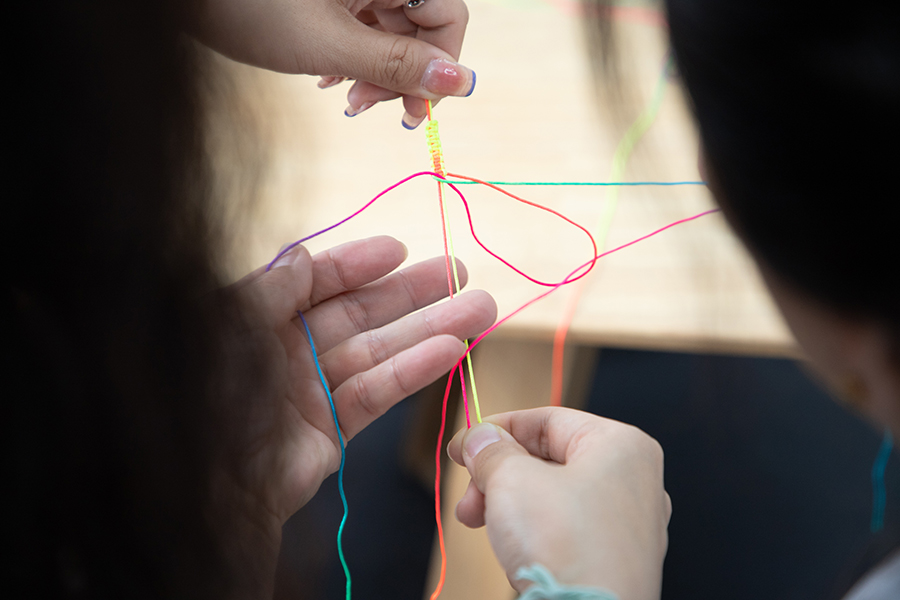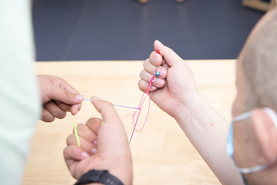 随后,在同伴辅导员的细心讲解下,同伴们两两结对,认真学习编织五彩绳。经过压、挑、穿、拉等步骤,一条条有着漂亮的纽扣结、蛇结的五彩绳就这样诞生了。大家将制作好的手绳迫不及待地为对方戴上,在相互欣赏的同时,一张张脸上洋溢着幸福的笑容。