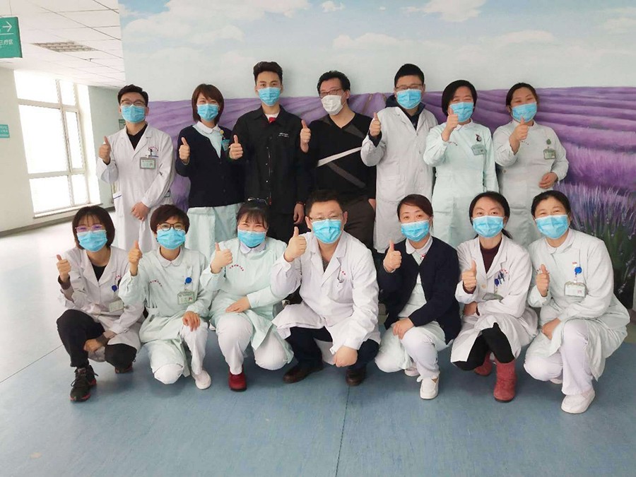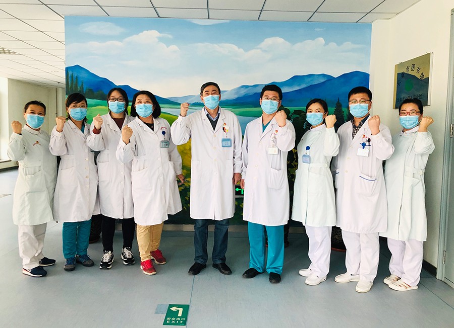 ▲3月9日,第一批防护人员完成隔离防护任务,临时党小组组长郑广翔主任带着他的队员们在病房前留下灿烂的微笑。