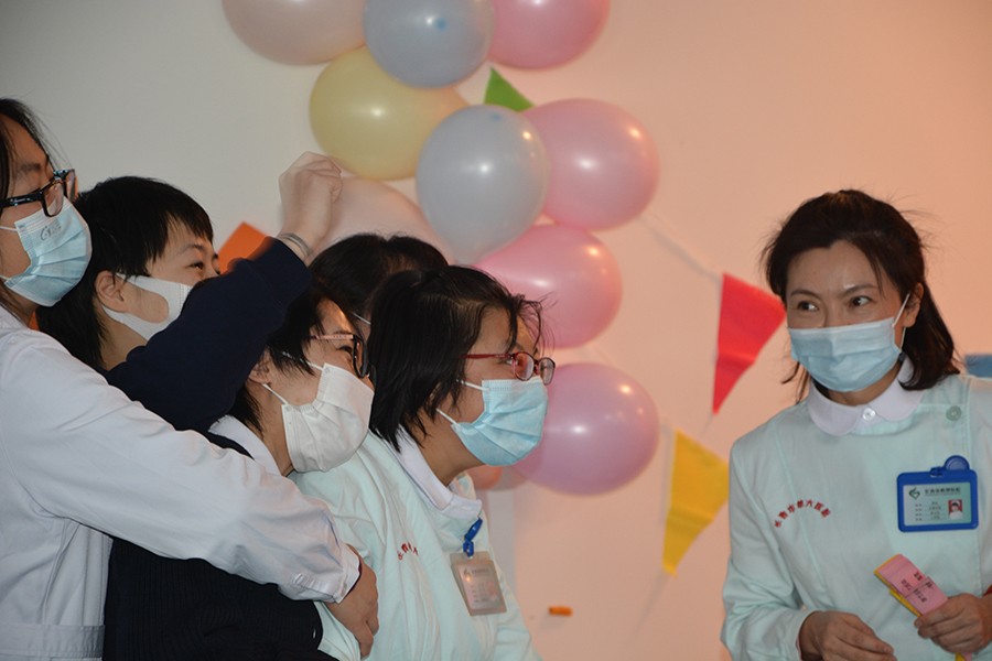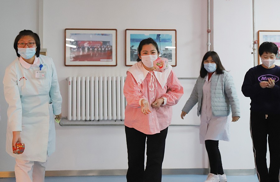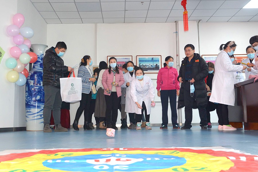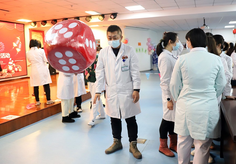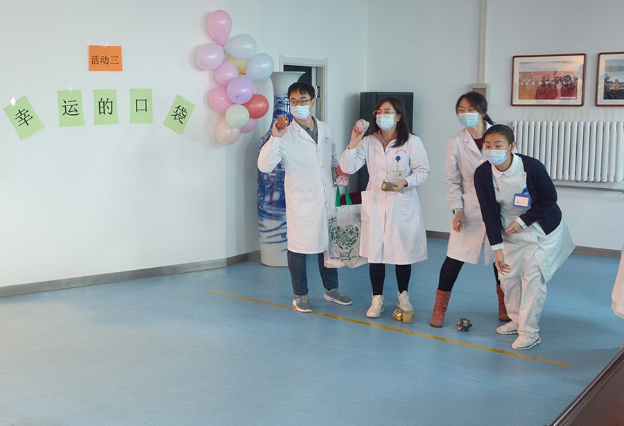 现场最热闹的项目要属“快乐呼啦圈”了,规则是两人一组,谁转的时间长谁获胜。在比赛现场,心理科五疗区护士张妍玥表现抢眼。虽然对手十分强大,但她仍凭借着灵活的腰身和稳定的转速,完胜对手。赛后,面对着众人的喝彩,她也忍不住“自夸”起来:“摇呼啦圈是我特长,可以挑战全院……”众人跟着大笑。同是心理科五疗区的护士刘雪松更是战绩非凡,在跟同事交流的时候说:“也没费什么劲,就拿了四个一等奖和四个二等奖!”