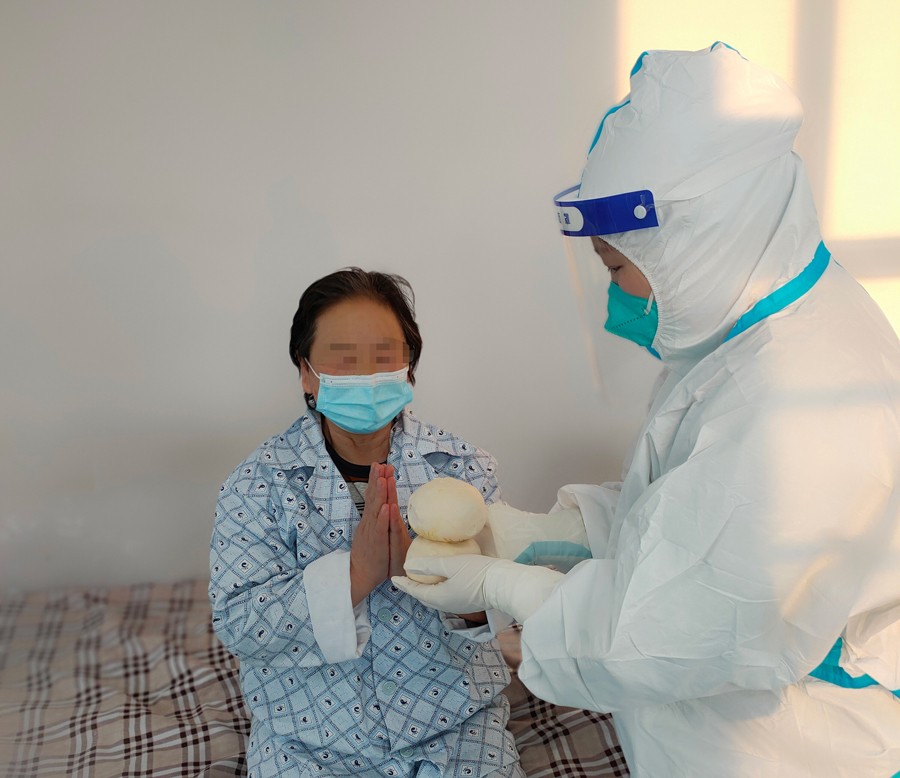 在抗疫一线,赵妍不仅做好日常护理工作,而且还细心观察患者心理状态。对情绪低落、焦虑不安、心烦失眠的患者,她总会及时给予安慰和心理疏导。一些患者在她的关心下,走出了心理阴霾。记得疫情期间,正赶上一位老人的生日,他的子女都不能回到身边。为了不让老人和家属留下遗憾,赵妍便为老人筹备了一个“特别”的生日。当时疫情前线物资并不是特别充裕,于是她用泡面代替长寿面,把馒头当作蛋糕,希望老人能长寿安康。当她把长寿面和生日蛋糕送到老人面前的时候,老人激动不已,场面瞬间变得格外温馨。“谢谢你们,不仅细心照顾,还为她过了一个暖心的生日。”老人的家属在电话中衷心地感谢赵妍。