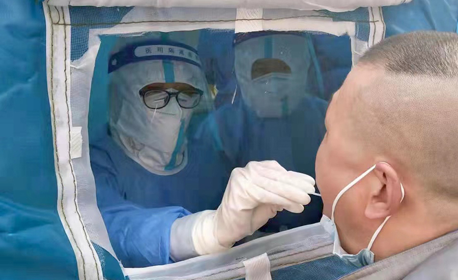 从医院整装出发后,战疫号角也随之吹响。她们在大巴车上分配好工作任务点,来不及安顿,直接投入到工作中。3月初的长春,风中依然带着寒冷,一场春雪悄然而至,风雪凛冽,气温骤降,六院人坚守在各自岗位上,咬紧牙关,与时间赛跑,与寒冷较量。工作中,大家经常会右胳膊抬到酸疼,左手指掰棉签掰到指尖肿胀,手被消毒液浸湿后变得冰凉。为了节约防护服,大家都尽量少喝水以减少上厕所的次数,由于昼夜温差大,白天被汗水湿透的衣服还没干,晚上的凉风吹来,在户外采样就会浑身打寒颤。