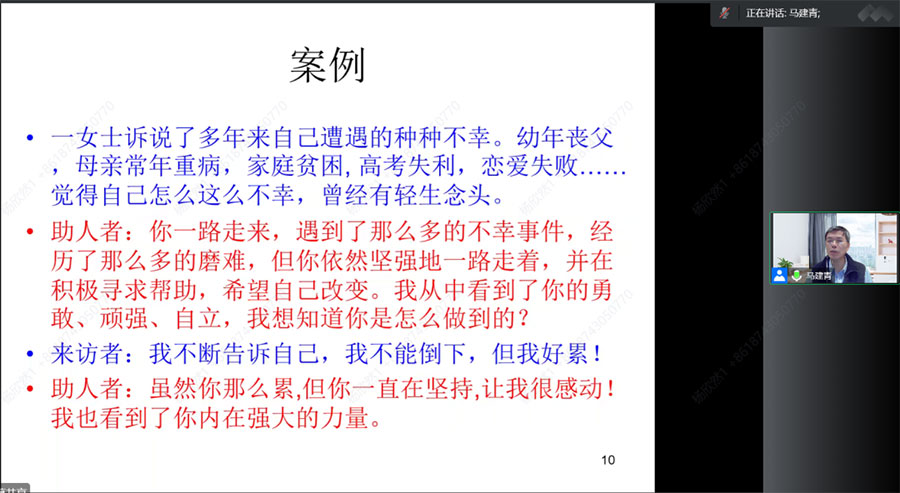 马建青教授的“焦点解决短期咨询在助人工作中的运用”讲座,焦点重视个案的成功经验、力量、资源、希望、小的改变及合理可行的目标,聚焦于问题解决而非问题本身,有利于实现建设性的改变,提升自信心、生活质量和幸福感受,具有非常重要的实用性和实效性。
