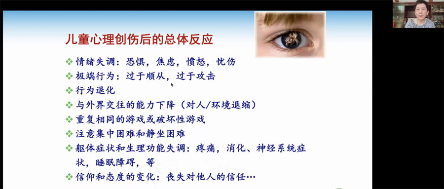张劲松教授的“儿童心理创伤治疗”讲座重点讲授了容易造成儿童心理创伤的事件以及儿童创伤后应激障碍(PTSD)等内容,介绍了很多的真实案例,理论与实践相辅相成。
