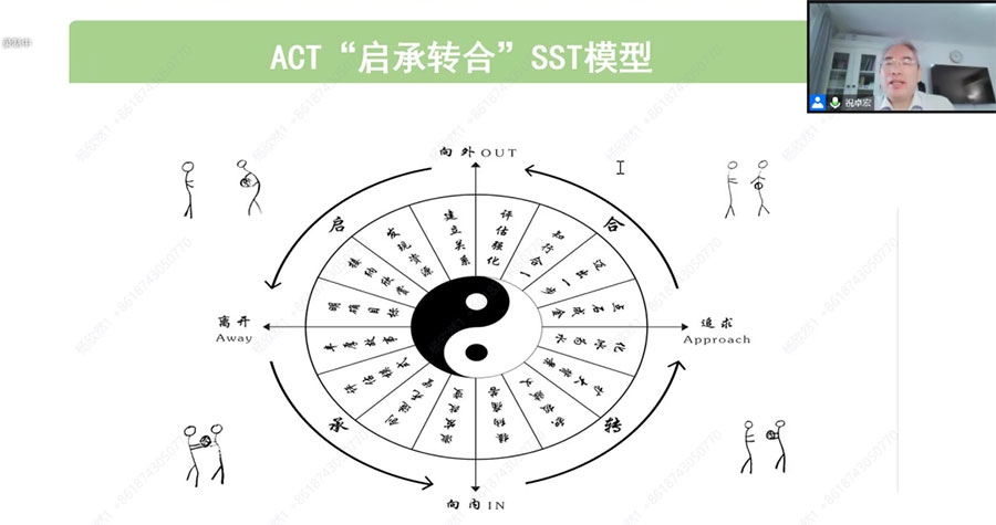 祝卓宏教授的“ACT单次咨询模式”讲座通过八卦图形和形象的小人对ACT“启承转合”SST模型进行了介绍,将复杂的理论知识变得形象生动、通俗易懂。