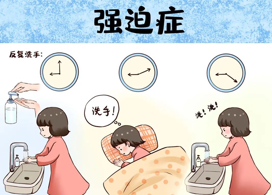 ■强迫症。有些强迫症患者会十分害怕接触外界的细菌和赃物,他们在外出回家后会反复地做清洁,占用了他们大量的时间和精力;还有些强迫症患者担心与人交流过程中,唾液飞沫会传染疾病,因此会避免外出或与人交往。在临床中,持续出现以上症状至少两周以上,才会被确诊为强迫症。